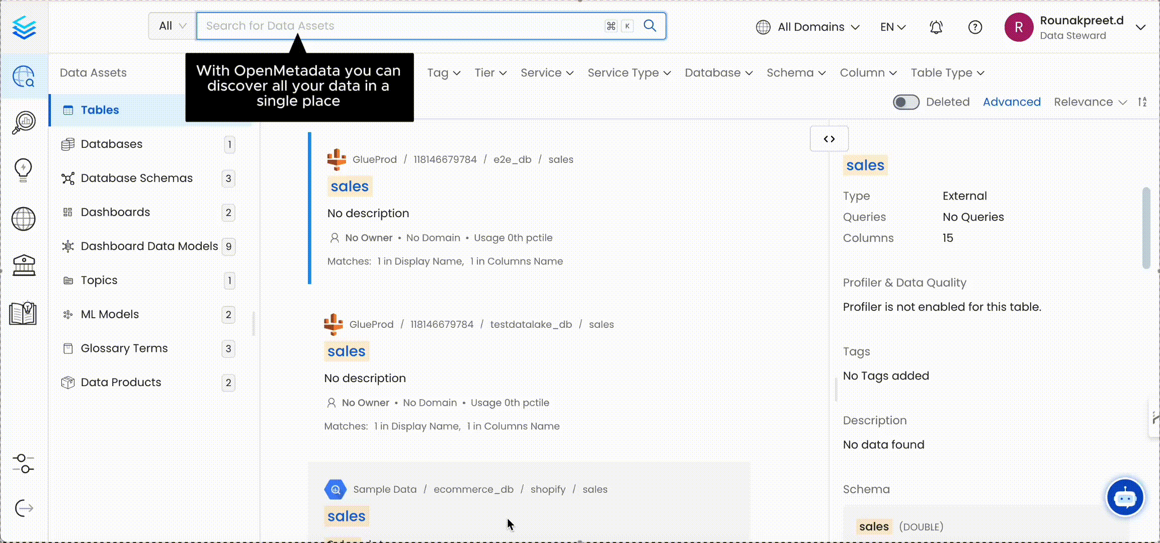 Multiple quick filter options further help to narrow down the search by Owner, Tag, Tier, Service, Service Type, and other filters relevant to the type of data asset like Database, Schema, Columns. You can also search by deleted data assets.